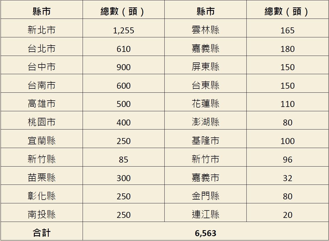 附註:1.農委會提供資料。2.實務上,因收容空間需隨時依當時送入之動物狀況(如體型大小、年齡、性品、動物行為、生理條件等)彈性調整運用,故可容納之犬貓數,並非固定值,另因目前計有17縣市正進行其公立動物收容處所改(興)工程,預估於106至107年間陸續完工,全國可收容動物總量會有明顯變動。