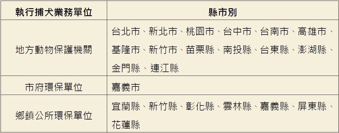 基於地方自治精神,《動物保護法》第2條第一項:本法所稱主管機關:在中央為行政院農業委員會;在直轄市為直轄市政府;在縣(市)為縣(市)政府。也就是說,在地方政府,到底由哪個單位來執行《動物保護法》?地方首長說了算!另一環節,捕捉犬隻並不是為了動物保護工作,而是為了處理流浪犬引起的公共安全、衛生等問題,早期是由行政院下令環保系統捕捉流浪動物,因此,到目前為止,因各地方政府人力資源受組織結構與財源限制無法擴充,尚有8個縣市(見表四)仍然由環保單位負責捕捉流浪動物,再交由農政系統的動物保護單位負責收容。