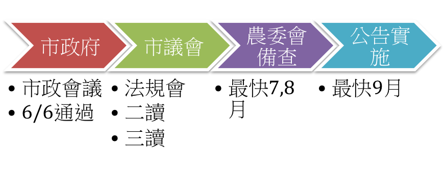 根據台中市動物保護處表示,《台中市動物保護自治條例修正草案》昨(6)日通過市政會議,接下來將送台中市議會審查,市議會內部流程還分為法規委員會、並且還要進行二、三讀,此外因為修正草案條文有牽涉到罰則,所以還需要送交農委會、行政院等備查,了解地方自治條例有沒有牴觸母法等等。
