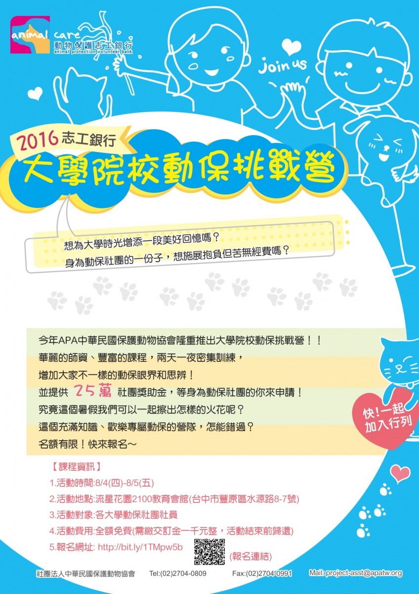 而一週之後,則是歷史悠久的APA首次舉辦大學動保社團挑戰營,APA自2008年起年年舉辦「動物保護志工培訓計畫」(志工銀行),培訓動保志工人力,今年特別在志工銀行中為大學動保社團設計「挑戰營」,邀請地方動保機關首長、法律專家、動保團體執行長、文字工作者及訓犬師,並安排有參訪公立收容所行程,從公部門到民間單位,從閱讀思考到實際行動,多面向的為大專院校動保社團的同學充實知識。