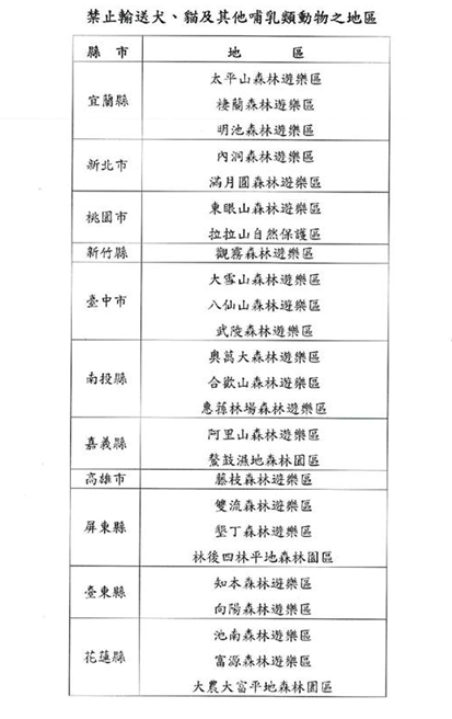 其範圍包括太平山、內洞、滿月圓、東眼山、觀霧、大雪山、八仙山、武陵、合歡山、奧萬大、阿里山、藤枝、雙流、墾丁、知本、向陽、富源、池南等18個國家森林遊樂區及大農大富平地森林園區、鰲鼓濕地森林園區、林後四林平地森林園區等區域;此外,棲蘭、明池、惠蓀林場等3個森林遊樂區也同時公告禁止犬、貓等哺乳類動物進入地區。
