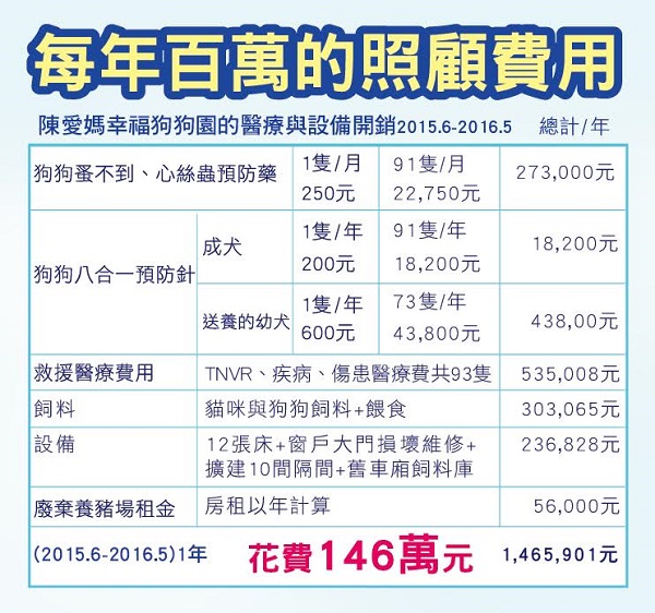 我媽媽--陳愛媽在苗栗通霄,利用廢棄豬舍造了狗園,又稱「幸福狗流浪中途狗園」,10年來花費近千萬的積蓄救援、照顧著200多隻流浪貓狗,一年光是流浪貓狗的醫療費用就高達150萬元。