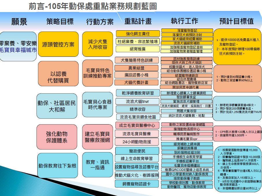 以上圖表,可說是新北市的「動保白皮書」。新北市政府在零棄養、零安樂、貓狗下一站幸福這樣的願景之下,有源頭控管、加強推動認養代替購買、社區和解、強化保護體系、動保教育紮根等5項施政目標,在2016年各有具體的行動方案。
