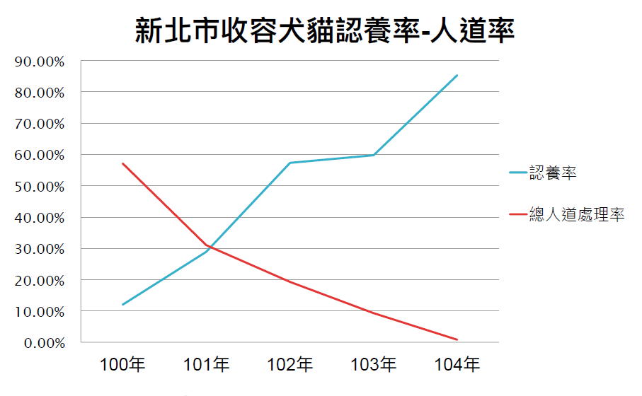 如表所示,民國100年,新北市認養率大概12%左右,到104年已達86%;相對的,100年時,人道處理率將近57%, 104年下降到0.9%。大家可能會問:「所謂0.9%,在新北市佔多少隻?」我們估算是950隻左右,也就是104年這一年當中新北市人道處理的大約總數。