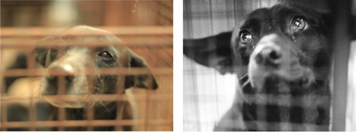 大家可以看看這兩張圖,動物在收容所中的眼神真的是這樣。各位知道,狗在開心的時候會笑,難過的時候也會流露悲傷。所以大家在零安樂實施後,想將寵物問題丟給政府時,請先想想你的夥伴動物被入所收容後的表情,於心何忍?至於我們執法單位,想要減少入所收容,第一件事就是必須強化飼主責任,另外是杜絕非法繁殖買賣。