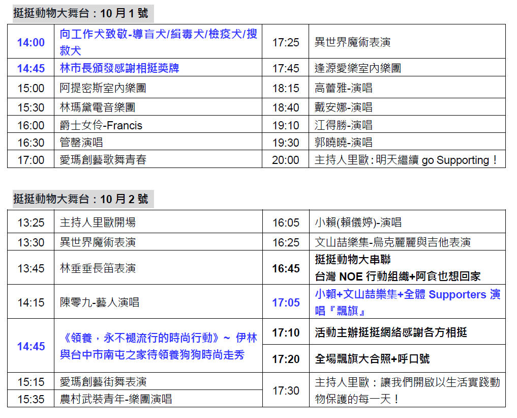 在舞台活動部分,兩天都有歌手、樂團演唱,1日還有「向工作犬致敬」活動,現場將請到檢疫犬、緝毒犬、搜救犬、導盲犬,以及相關單位向民眾介紹這些勞苦功高的小夥伴。2日時,則會有10位伊林名模帶著台中市動物之家的狗狗走秀,提高收容所內犬隻的能見度。