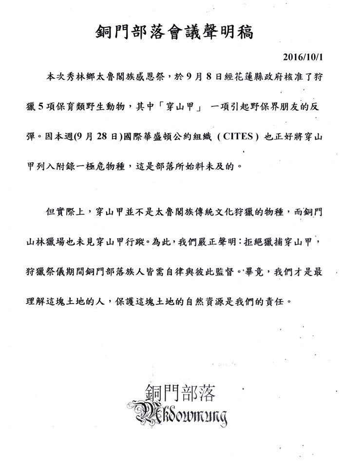 林務局乃立即責成該局花蓮林區管理處和申請狩獵的部落族人溝通,並獲慕谷慕魚發展協會鍾理事長與銅門部落主席鍾德光善意回應,均承諾將告知部落獵人禁止捕捉穿山甲,並將積極保護穿山甲。