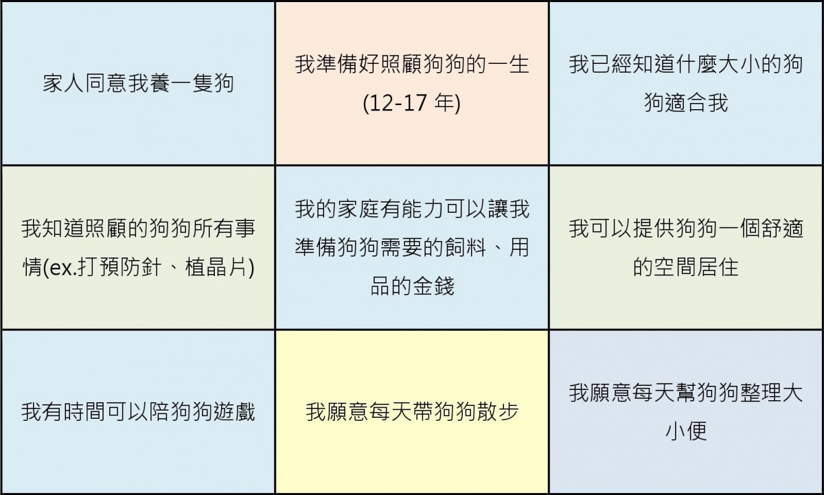 同樣使用《小狗花花》進行教學,對中年級小朋友就可以加深層次,例如講述動保法與飼主責任,下面是飼養動物的評估測驗,只要完成9格任務,就代表具備基本的飼養能力了。