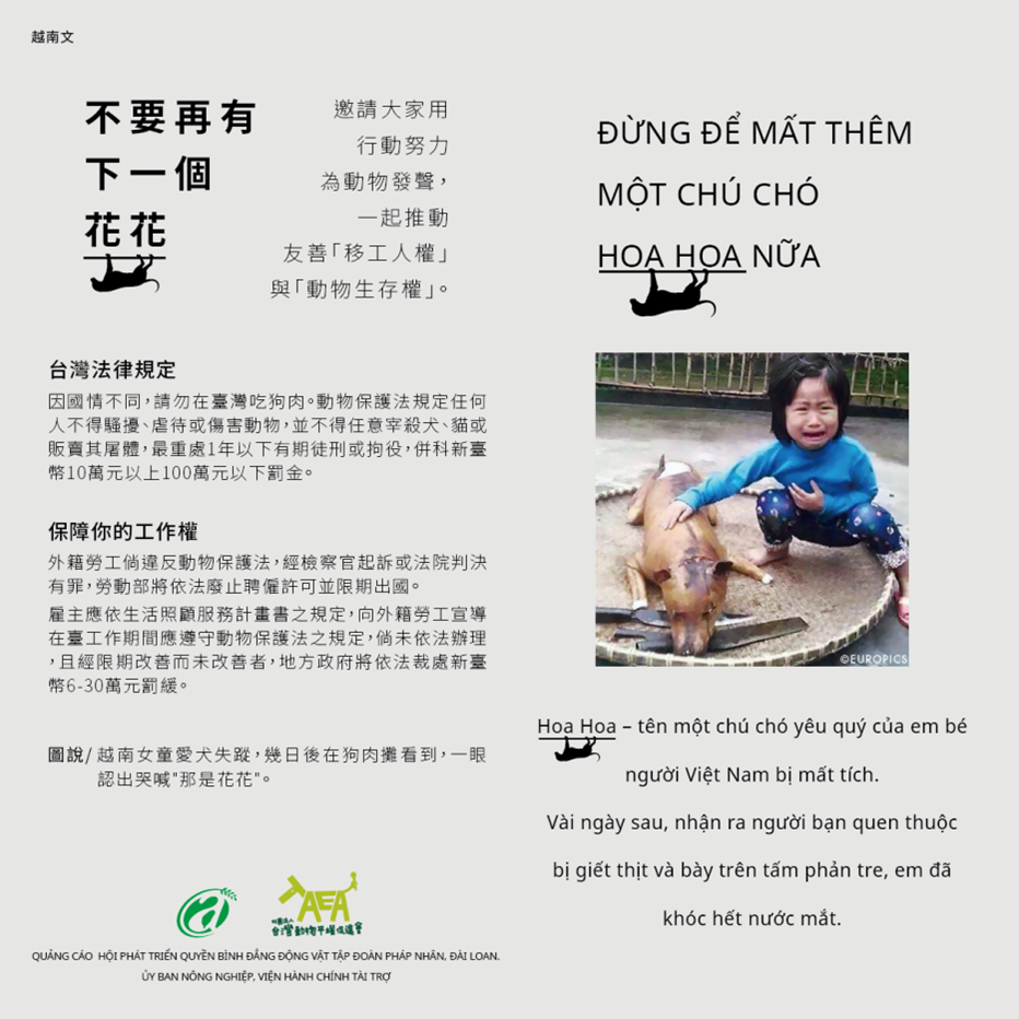 舉例來說,之前曾經因外籍移工吃狗肉的事件,媒體與輿論鬧得沸沸揚揚,許多人跑去領事館抗議、找立委開公聽會等,議題看起來非常熱,可是當我們開始為此推動法令教育,希望發傳單告訴移工,在台灣吃狗肉會觸犯動保法,想動員大家一起來宣傳的時候,發現許多當初講得很熱的人,對這一塊幾乎沒什麼感覺,不像抗議時那樣有熱度。因此,我覺得教育這件事看似容易,但只有真正去做時,才會了解有多麼困難,而且很難獲得肯定,這是我的親身體會。