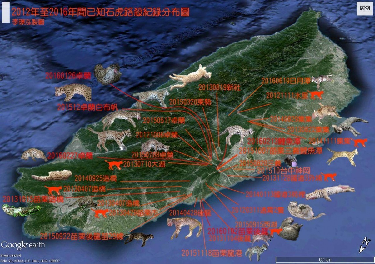 「2016年到9月為止,已經有37隻石虎被路殺,把石虎被撞死的畫面一個個從地圖上標示出來之後,即可發現幾乎都發生在苗栗。台灣的石虎剩下不到500隻,等於每年都有將近1/100的石虎被撞死,不知大家做何感想?」