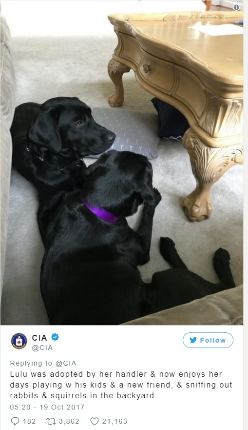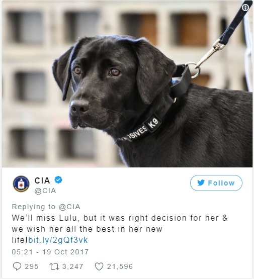 CIA在Twitter上寫到:「我們會想念露露的,但這對牠來說是對的決定,我們祝牠的新生活一切都好。」