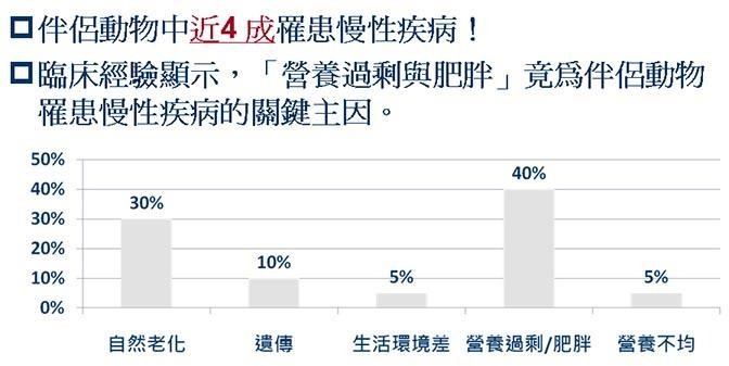 現代人飼養伴侶動物的心態已與過往截然不同,主人已將他們當作小朋友一樣的寵愛,近年來, 由於他們生活方式和飲食的改變,罹患慢性病這種文明病的比例也逐年增加,動物罹患慢性病會造成免疫力下滑,使得感染傳染性疾病的機率增加二倍以上。