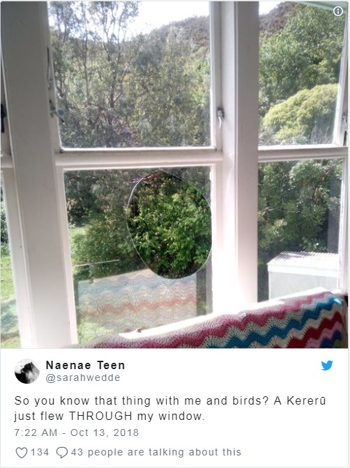 網友在貼文中寫到:「有隻紐西蘭鴿子直直飛過我家窗戶。」
