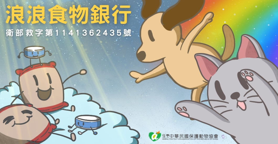 「中華民國保護動物協會」號召大家共同支持「浪浪食物銀行」計畫,給予動物收容處所實質上的支援,適時給予溫暖。
